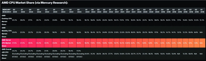 近日,权威市场调研机构Mercury Research公布了2025年第二季度x86处理器市场的AMD份额统计,EPYC系列产品再次表现抢眼。