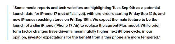 莫哈尼在报告中表示,尽管苹果尚未正式公布,但多家媒体和科技网站已预测苹果将于9月9日举行新品发布会,随后在9月12日开启预购,新产品预计于9月19日正式发售。此次发布会预计将推出四款新机:iPhone17、iPhone17Air、iPhone17Pro和iPhone17ProMax。其中,iPhone17Air作为全新机型,将取代现有的iPhone17Plus,主打轻薄设计,成为本次产品线更新的核心亮点。
