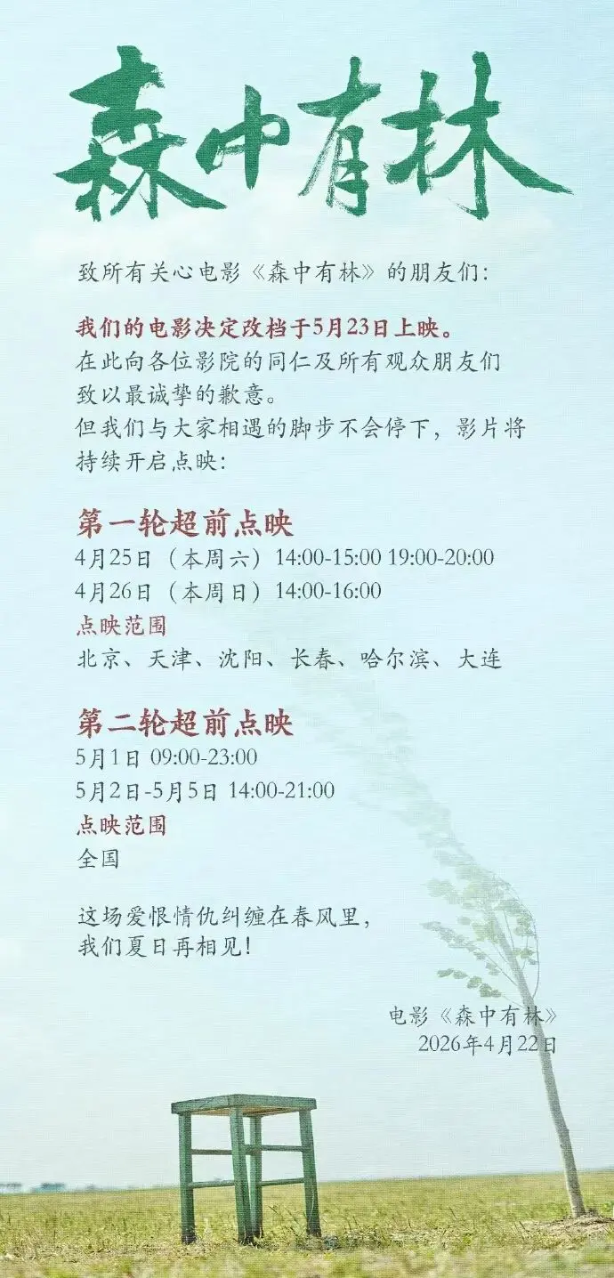 4月22日,由于和伟、高圆圆、韩庚、张天爱等主演的电影《森中有林》宣布改档5月23日上映,并将持续开启点映。据悉,该片原计划于5月1日上映。