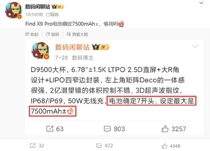 oppo Find x9 pro将会搭载天玑9500处理器,预计在10月初能上市,配备LPDDR5X+UFS4.0,内置7500mAh电池,支持80w有线充电+50w无线充电,有大电池能带来强劲续航体验。