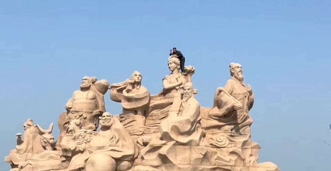 2月27日,有网友在社交平台发布视频爆料一游客的不文明行为。画面显示,在山东省烟台市蓬莱区,一名男性游客站在“八仙过海”主题雕像群中何仙姑雕像的肩膀上,身体前倾伏在雕像头部,同时举手摆出姿势让同伴拍照,该举止看上去十分危险。